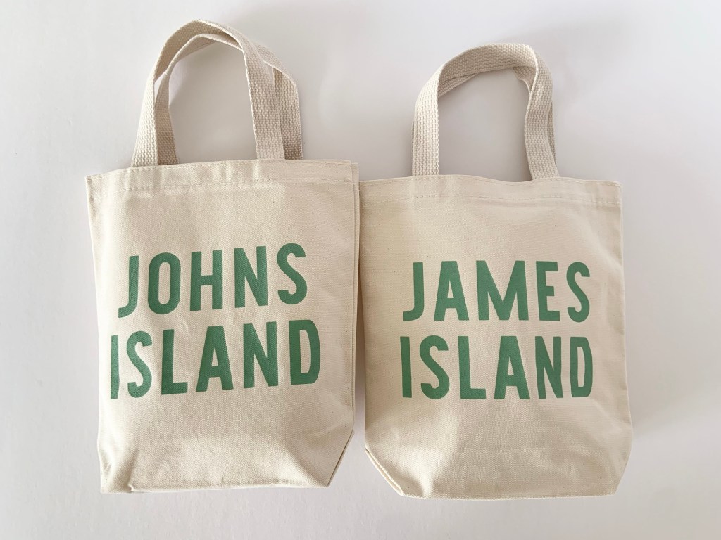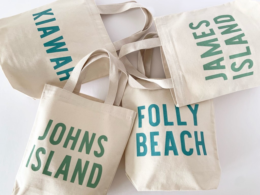 Love these local items I recently made for Stono Marsh Co in Charleston, SC. All totes are size Small: Folly Beach and Kiawah totes are printed in Seafoam; Johns Island and James Island totes are printed in Sage; CHS totes are printed in Blue.