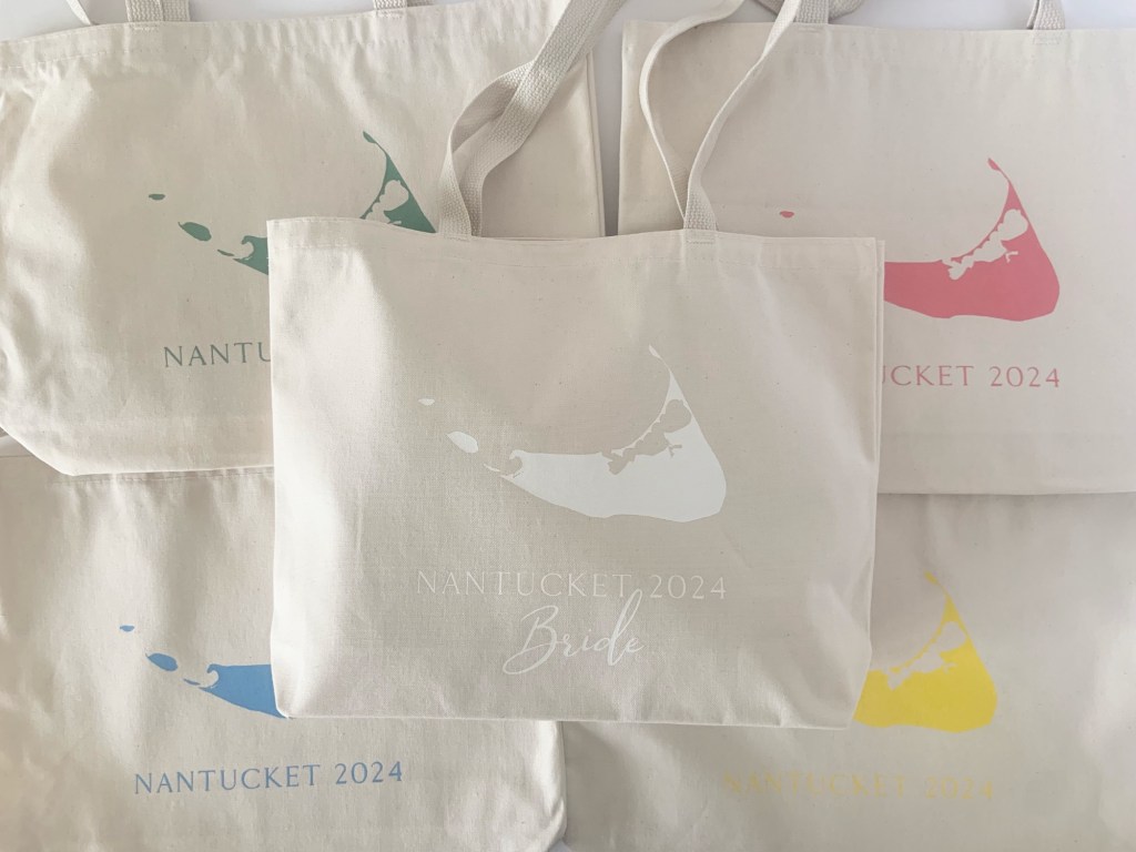 These colorful Nantucket totes were created for the bride and her bridesmaids to use on the wedding weekend in Nantucket. We worked together to create the design, playing with fonts and colors until they were just right for the occasion. I love how the bride’s tote bag came out, printed in white with “Bride” added to the text. Each bridesmaid received a different, bright, colorful Nantucket tote, which is so playful and fun. These sweet totes are available for customization on Etsy. Nantucket tote bags can also be customized through Faire Wholesale for retail shops.
