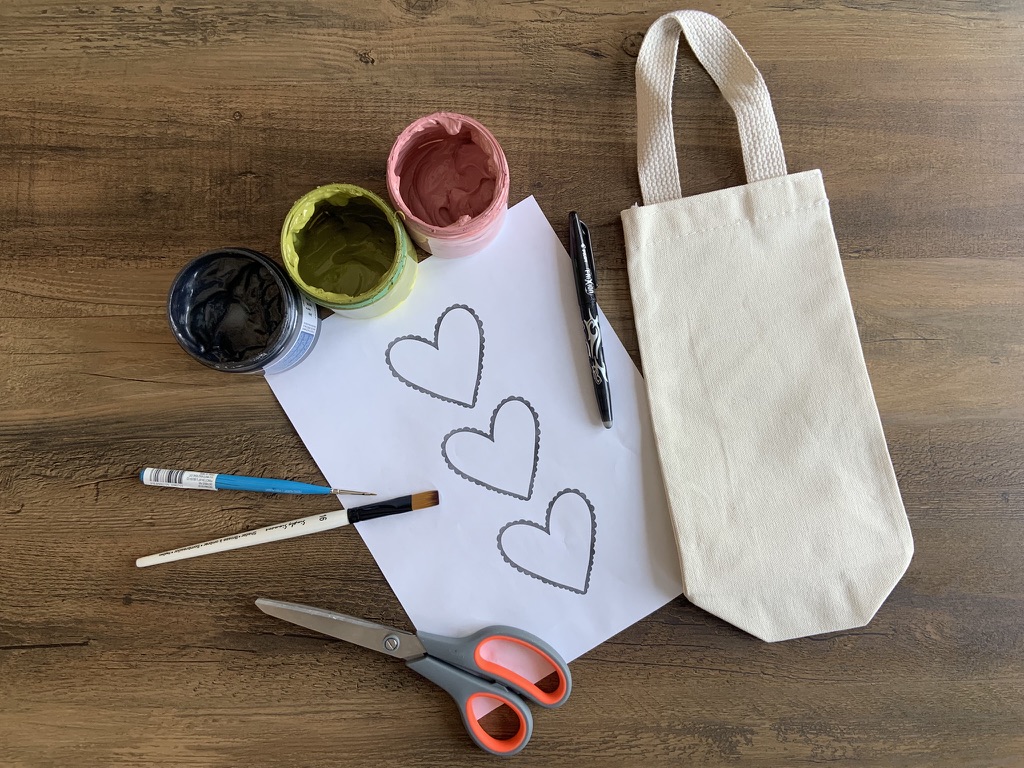 Using a window or light box and your Frixion pen, lightly trace the hearts onto the outside of your bag. A general idea will do – it doesn’t have to be perfect, you can improvise the scallops as you paint. Focus more on making sure your hearts are centered on your bag.