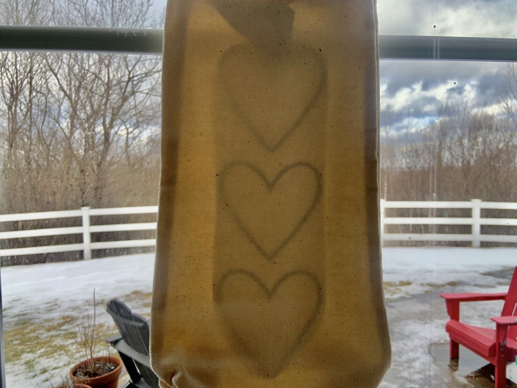 Place the heart design inside the bag aligning with the guides you made on the outside. Hold up to a window/light so you can see the design as you align it. Once in place, use a piece of tape to hold it in position.