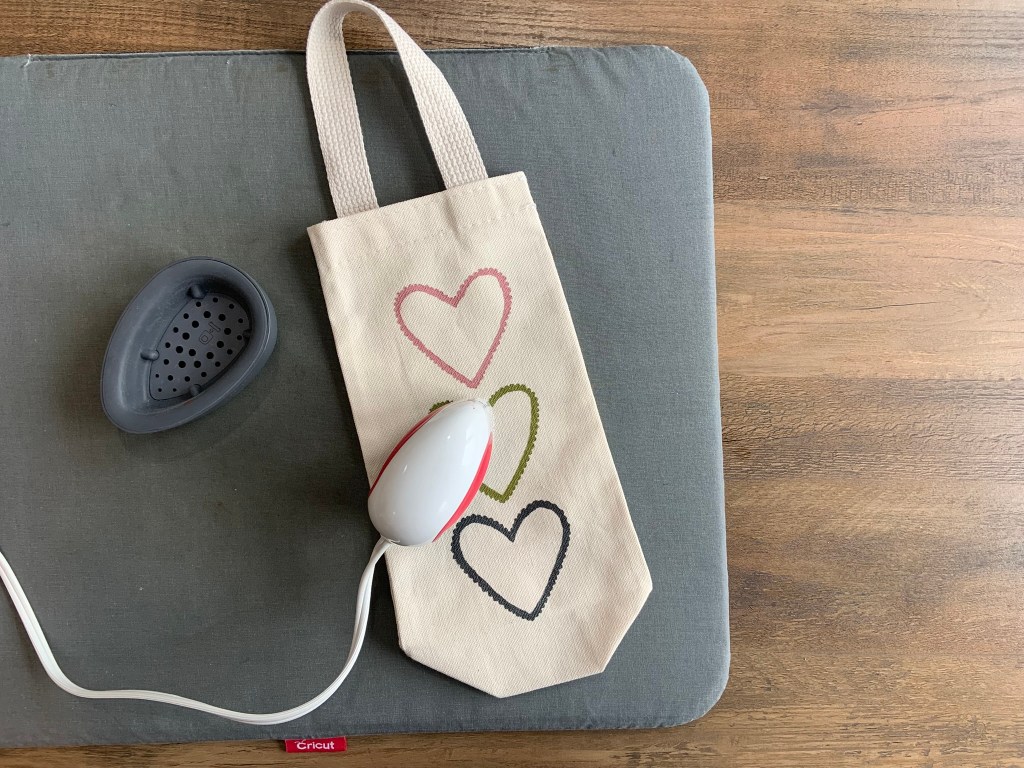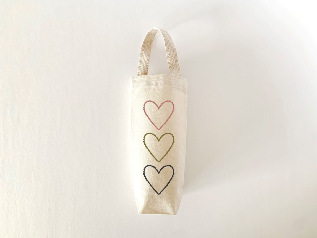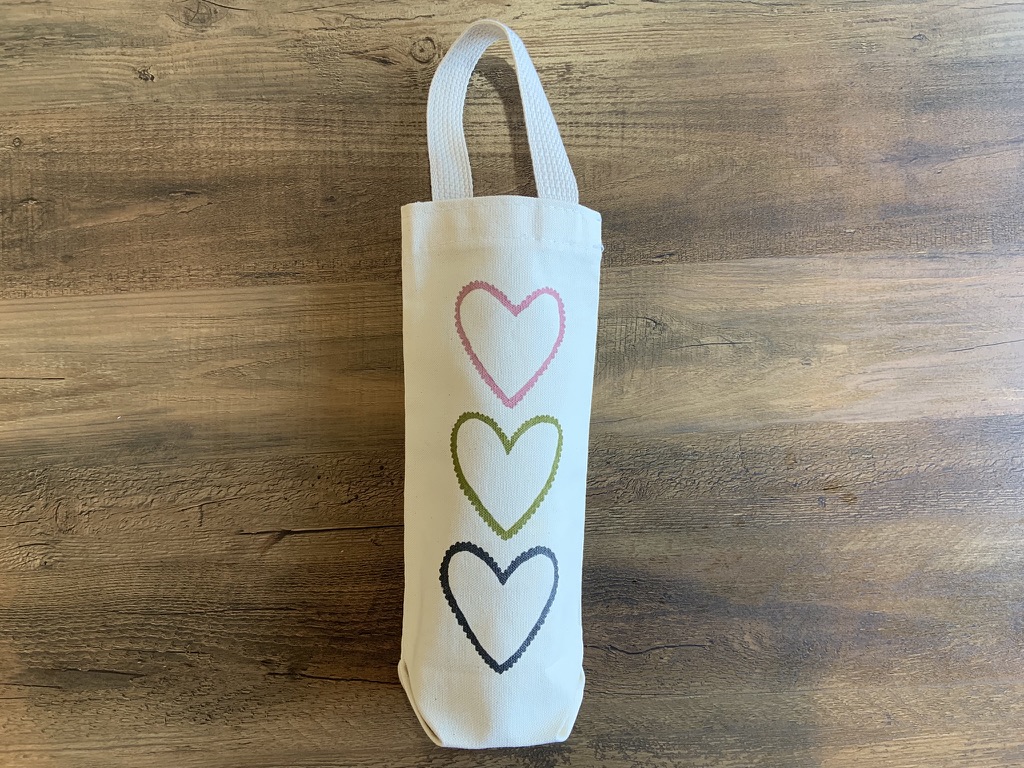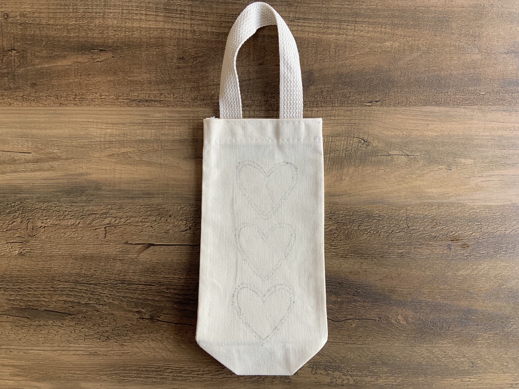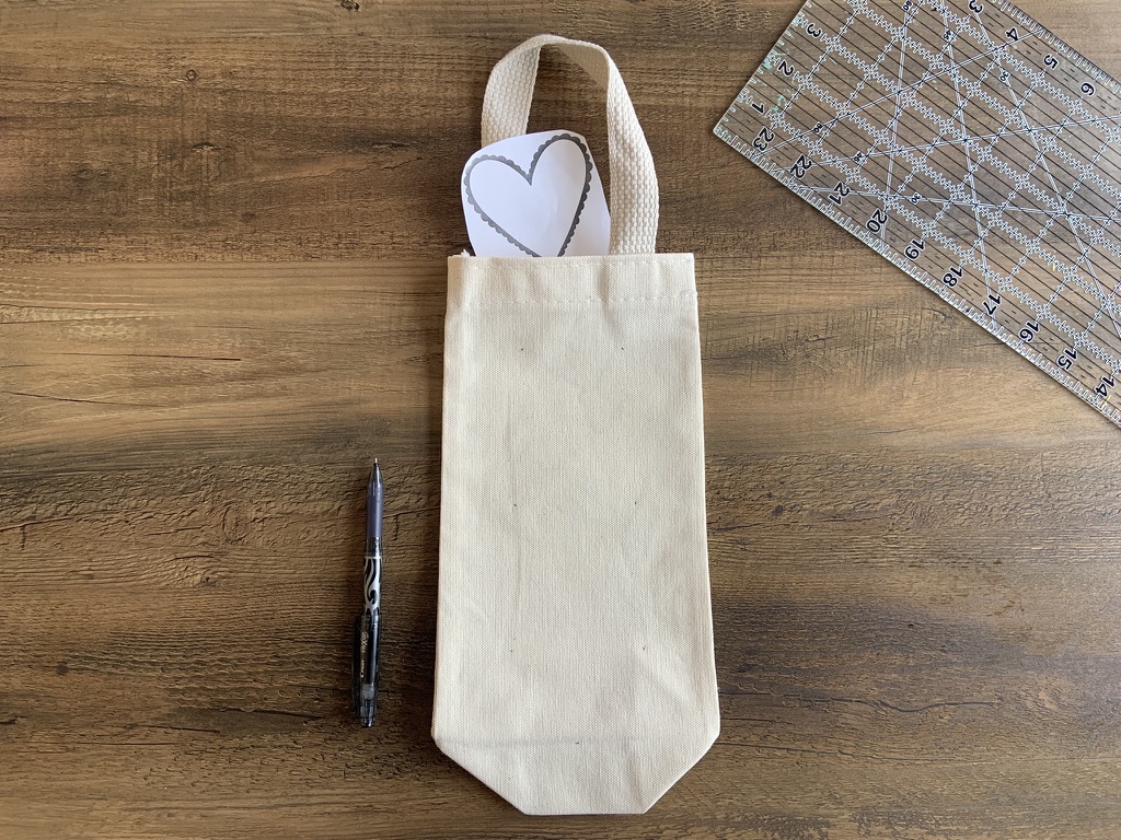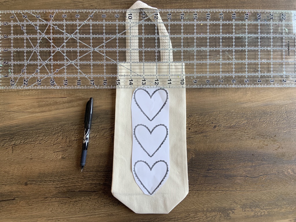 Cut design to fit inside wine tote, close to edge of hearts. Using your Frixion pen, measure and mark the placement of the hearts on the outside of the bag to use as a guide: about 2″ down from the top, 1 1/2″ up from the bottom, and 1 3/8″ in from each side.