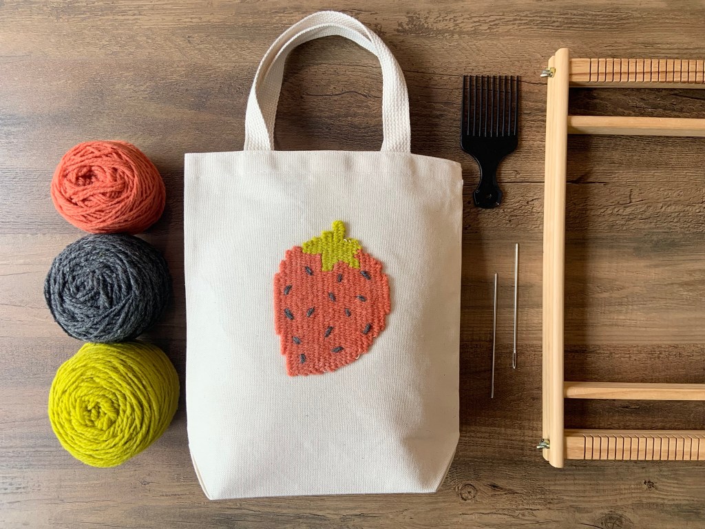 I love crafting and all things fiber; sometimes it trickles onto my tote bags! Adding your fiber arts onto tote bags is a great way to show off your craft in a functional way. For my strawberry tote, I wove my strawberry on a loom. Instead of tucking in the warp threads at the end I just snipped them off the loom leaving long threads. I used a fabric glue to adhere them to the back of my weaving. I also sprayed my weaving with a stiffening spray – this helped keep the weaving in place. Then, I used a double sided iron on adhesive to attach my weaving to my tote.