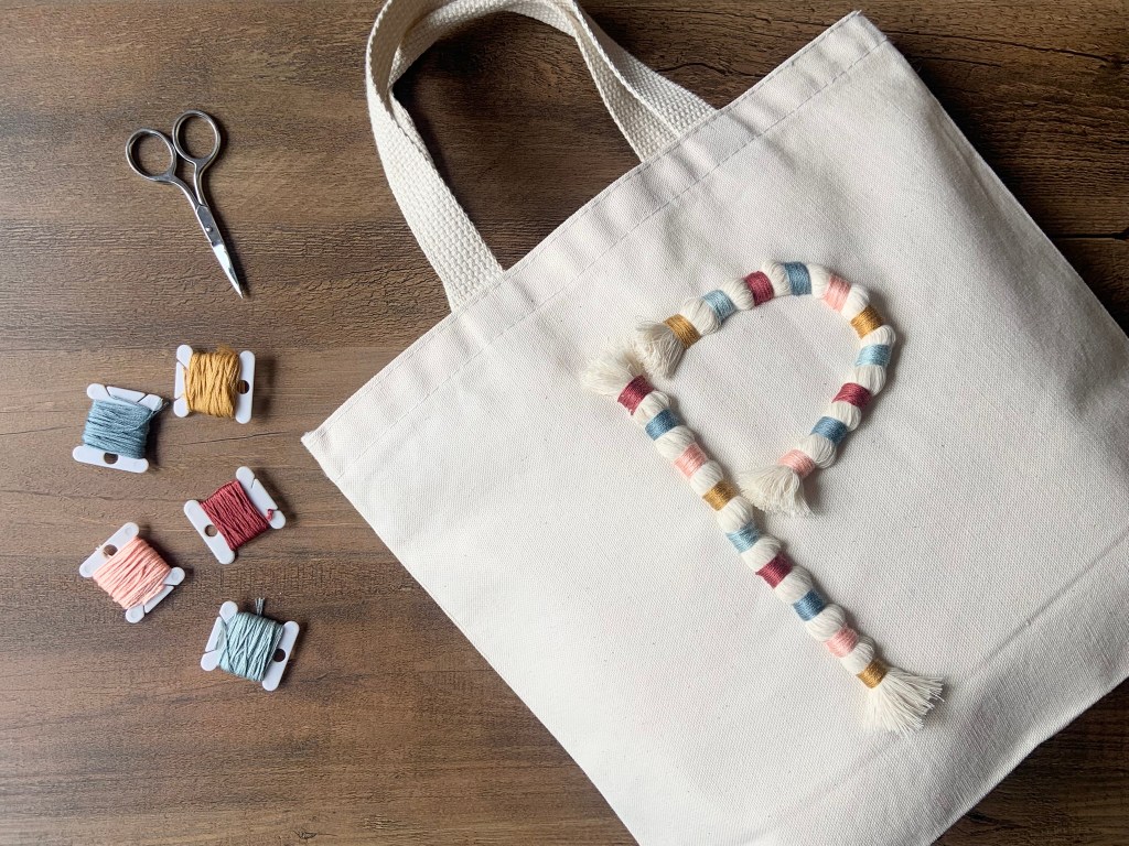 Using thick macrame string and embroidery floss you can use the couching stitch to create your own initial tote on my tote bag blanks. To protect your stitches on the inside of your bag use double sided iron on adhesive and adhere a piece of fabric or felt over your stitches to keep them from snagging. Have fun!