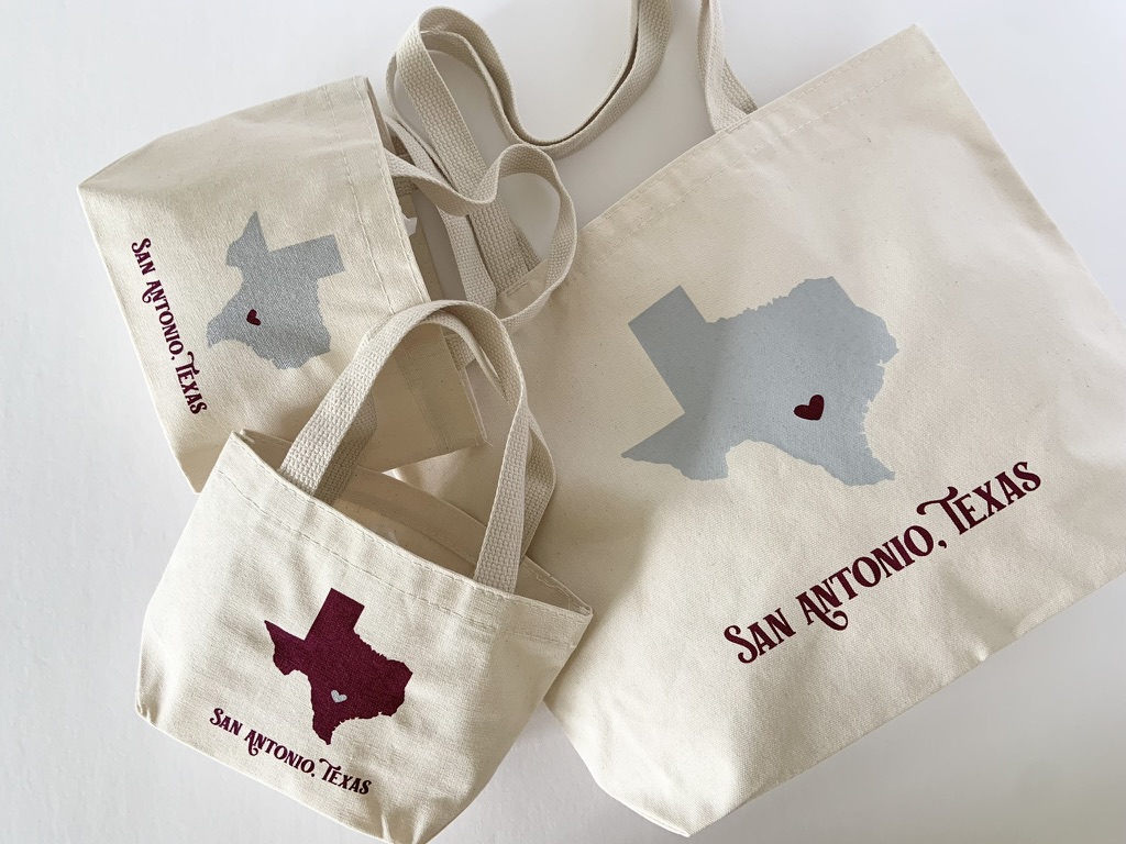These are my Extra Small and Extra Large Texas totes with custom colors and text. All of my totes are fully customizable. Available individually or in bulk with bulk pricing. Check out my Etsy shop for more information!