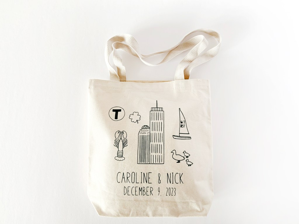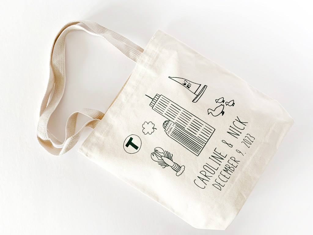 These are my large Boston Icon totes printed in dark green ink with custom text below the icons. I made them for a December wedding and love how they turned out with this font choice. All of my bags are fully customizable from bag size to colors to custom text. They are available individually or in bulk with bulk pricing for weddings and events.