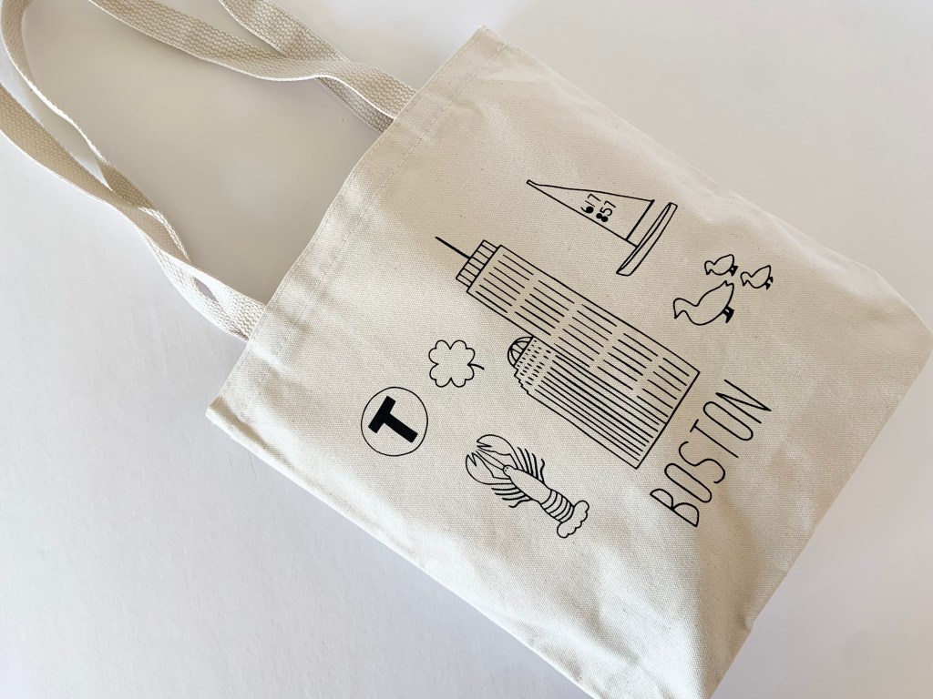 Boston Icon design printed on the large tote bags.